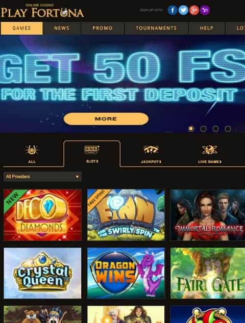 The search bar and the system of sorting games are responsible for the navigation on Play Fortuna. The keypad helps you to learn more about promotions, tournaments, bonus offers and contact the technical support. All games are sorted by genre as well as by the provider. For example, if a player is interested in Microgaming slots, he/she simply goes to the Slots tab and selects the appropriate provider from the drop-down menu.